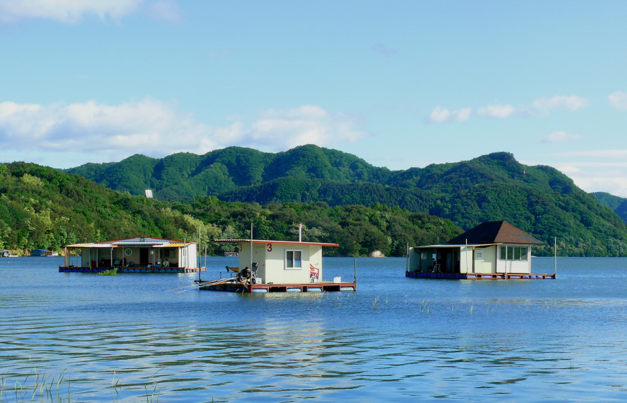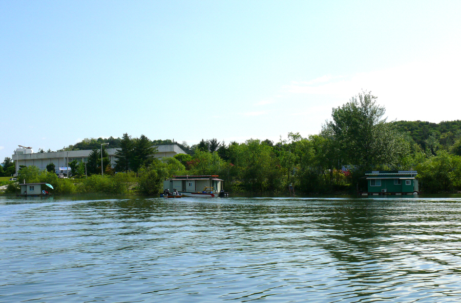 자갈섬 낚시터는 이런 콘도형과 펜션형 좌대들과 일반형 좌대들이 포인트 마다 배치되어 있다.