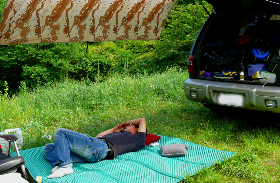 행복해 하는 아내가 텐트에 몸을 눕히고 조곤조곤 코를 골면서 자기 시작한다.