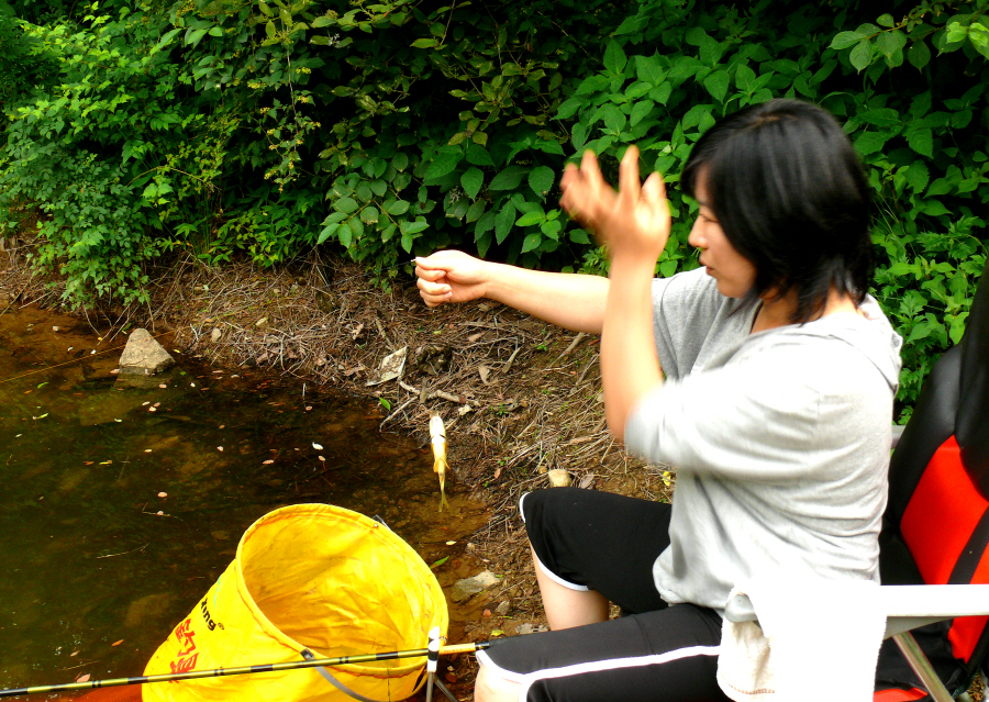 비가 그치고 아침에 다시 낚시를 시작한 마눌님입니다.