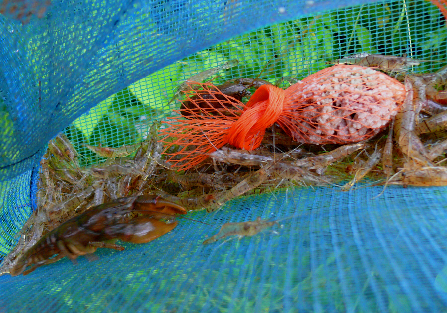 밤에 넣어 놓았던 새우망에 가재와 새우가 가득합니다.