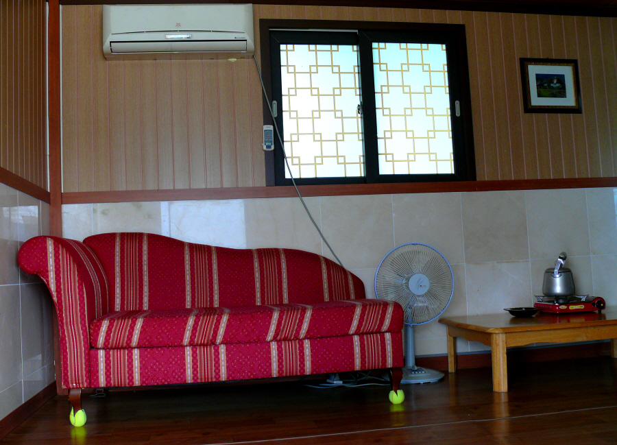 거실에는 에어콘, 쇼파, TV를 시청할 수 있습니다.