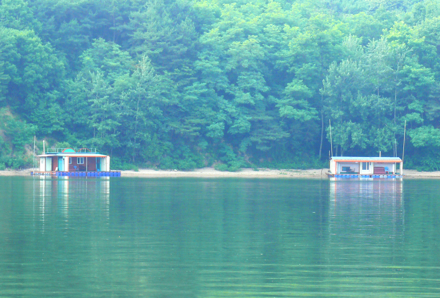 삼천낚시터 관리소와 산쪽에 배치된 수상좌대 전경