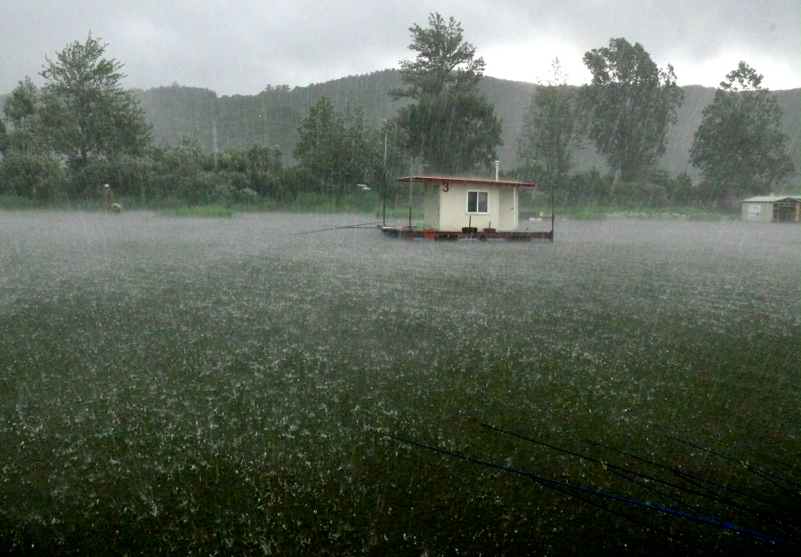 아침 6시경 20분 정도 강풍과 국지성 폭우가 쏟아지더니 물이 출렁거리기 시작하고 찌들이 밀려 다닌다.