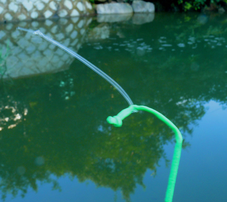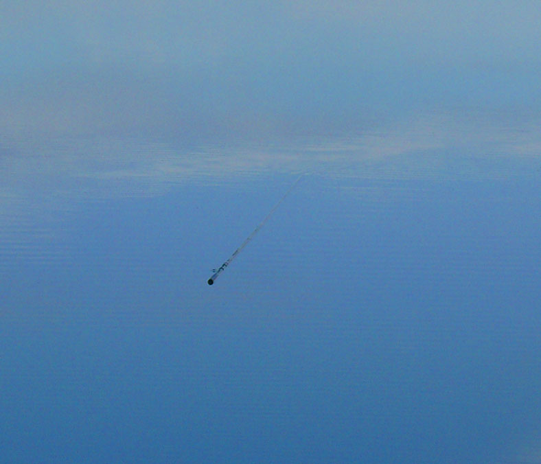 끌려 나갔던 낚싯대가 걸려 있던 붕어가 떨여 졌는지 바람에 밀려 다시 상류쪽으로 돌아 오는 바람에