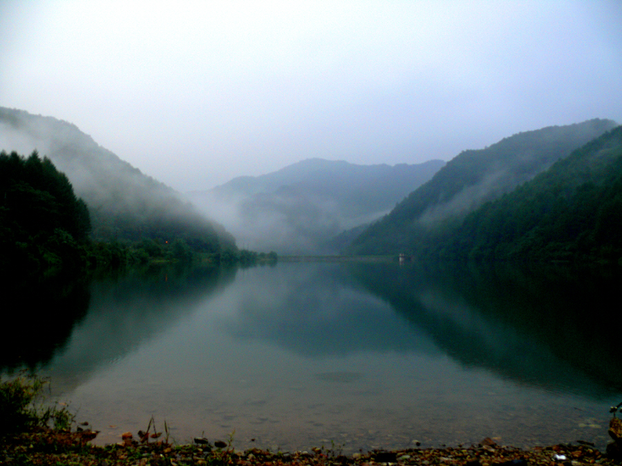 가을비가 잔잔히 내리면서 산 이슬과 안개가 자욱한 청량지의 아침.