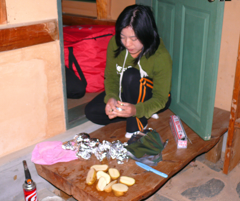 아궁이에 장작불 집혀서 감자 구워먹다 보니 피곤함에 저절로 눈이 감긴다.