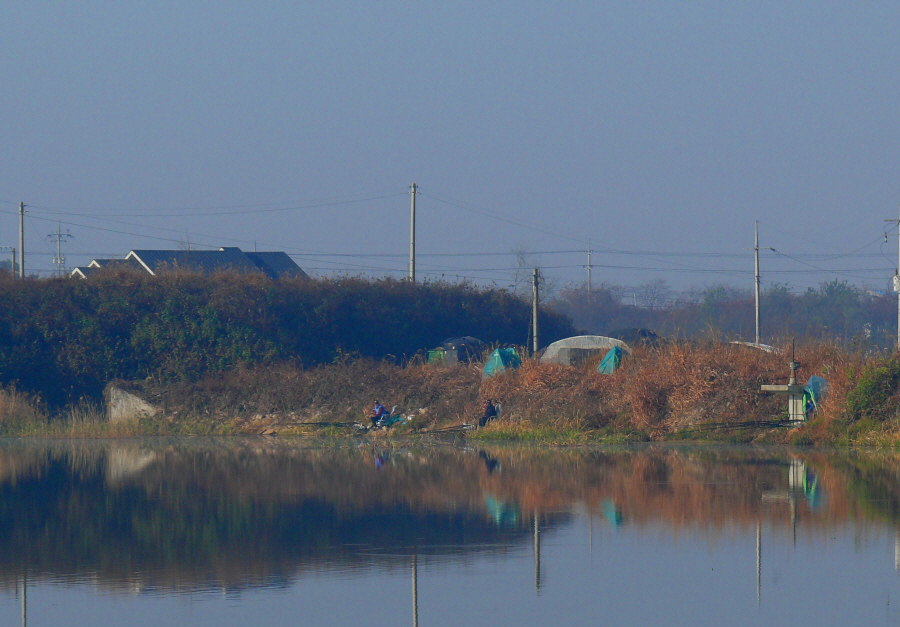 제방 끝자락 수초대에 먼저 온 조사들이 낚시 중입니다.