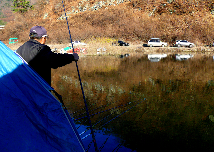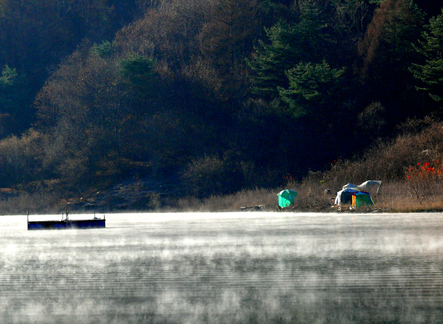 좌대들과 연안에는 텐트를 치고 2박 3일 정도의 여정을 가지고 들어 온 조사들이 자리를 잡고 있었으며,