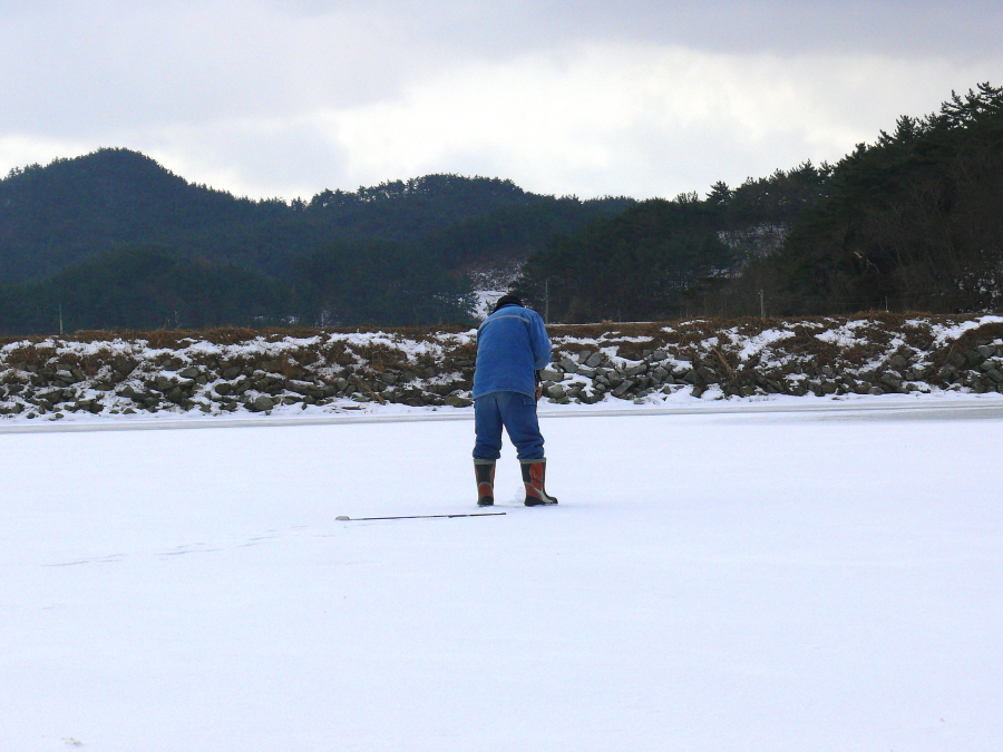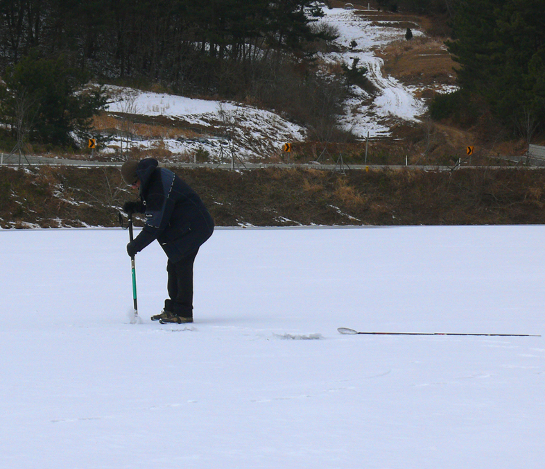 눈 덮힌 이곡지에 도착해서 중앙부근에 구멍을 뚫어 보았는데 수심이 2미터권이 채 나오지 않는다.