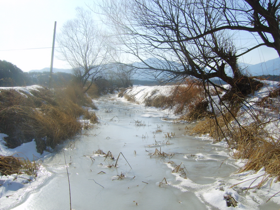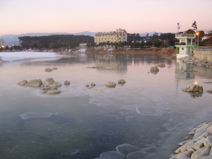요 며칠 겨울날씨 같더니 연곡천 하류가, 꽁꽁 얼어 버렸네요.