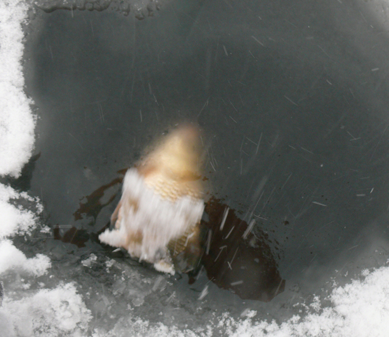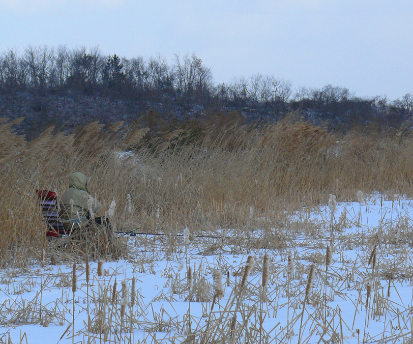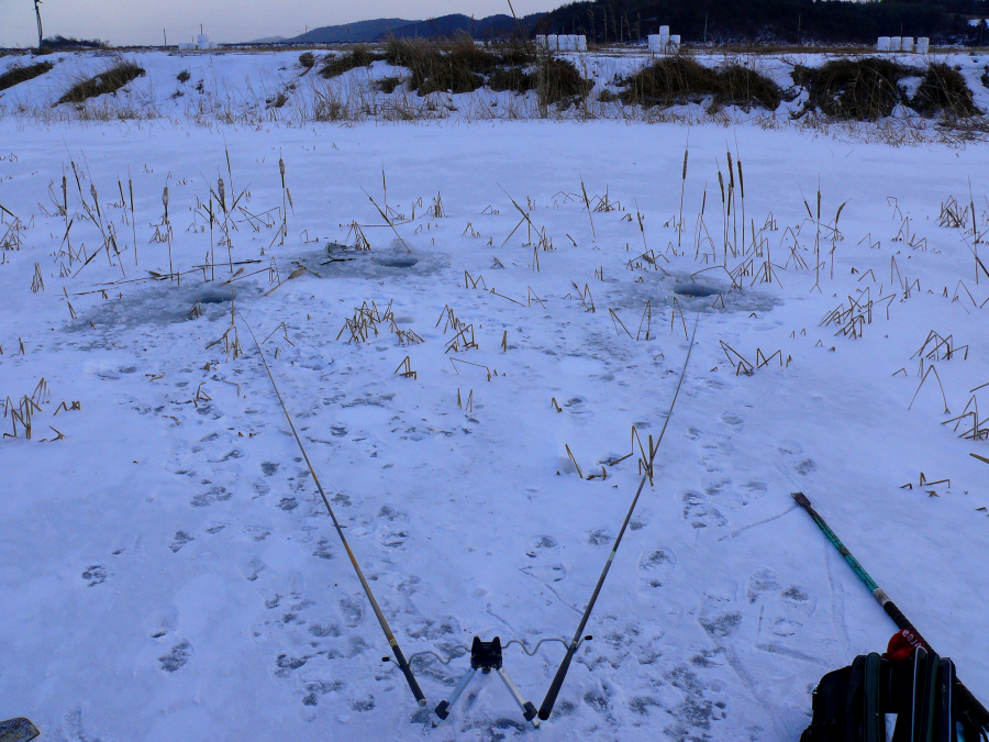 제방 앞 말풀 포인트에 두꺼운 얼음구멍을 뚫고 채비를 드리웠는데 바늘에 지렁이를 꿰기 무섭게 지렁이가 얼어 버릴 정도다.