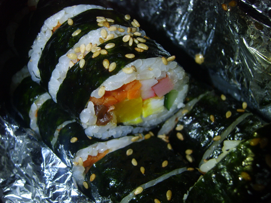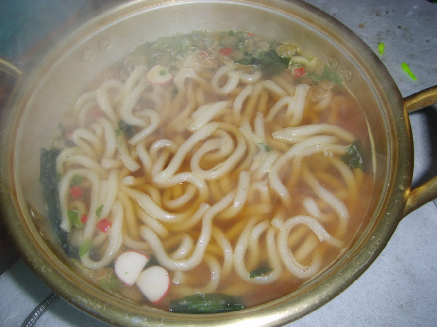 김밥을 따끈한, 우동 국물과 함께,...