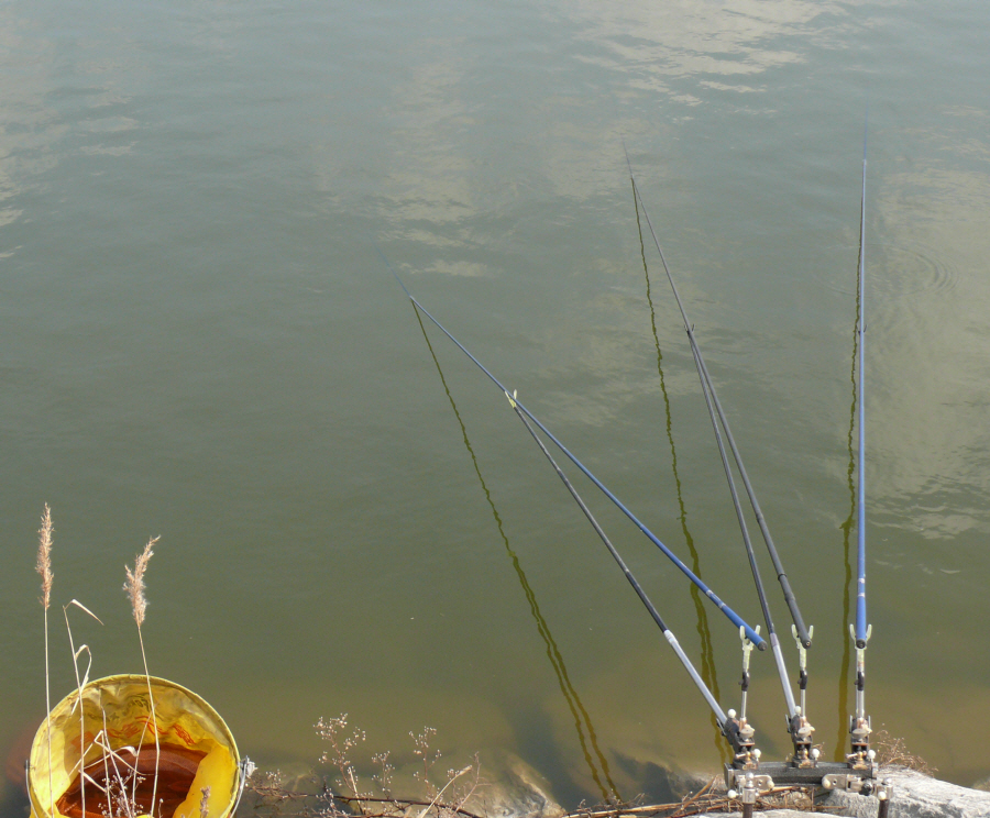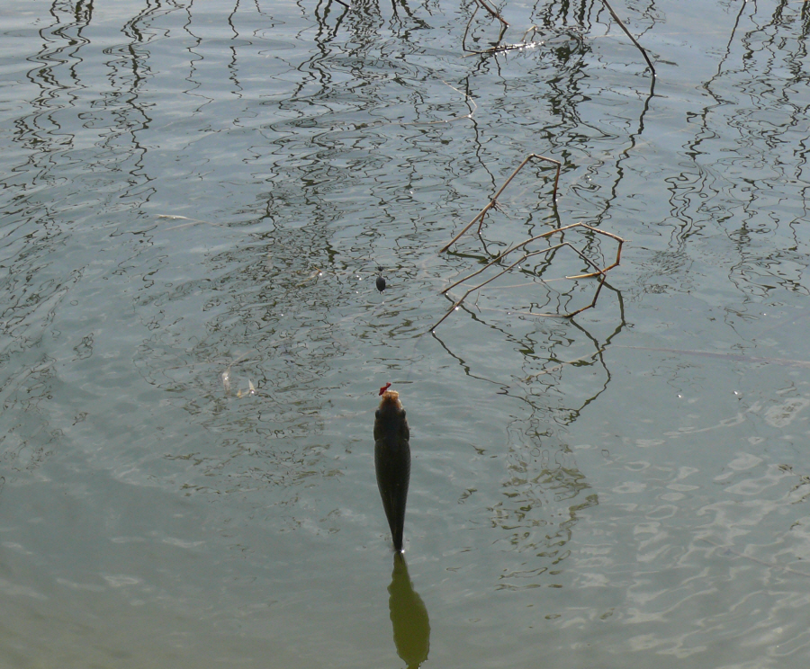 차를 세워 놓고 잠깐 수초채비를 갈대수초 사이에 밀어 넣고, 담배 한대 피려는 순간 찌가 껌뻑거리더니 이내 밀어 올린다.