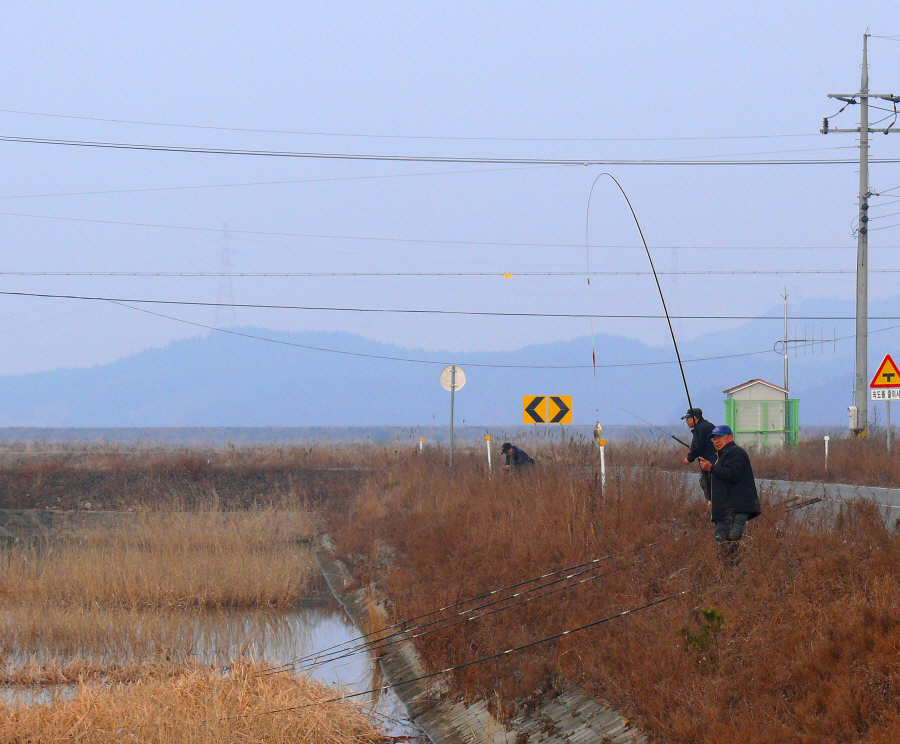 길가에서 낚시를 하는 모양세가 별로여서 두마리만 챙겨서 기억자수로의 포인트에 도착을 하니 동출한 쌍칼잽이님과 둥근님도 깜짝 놀란다.