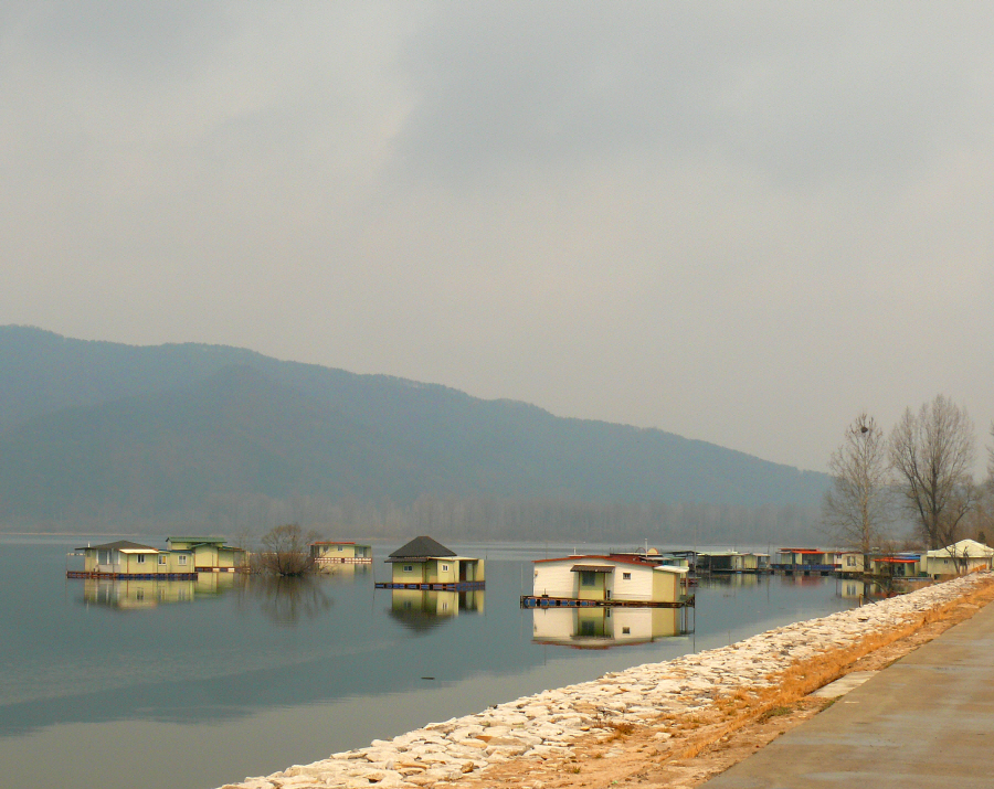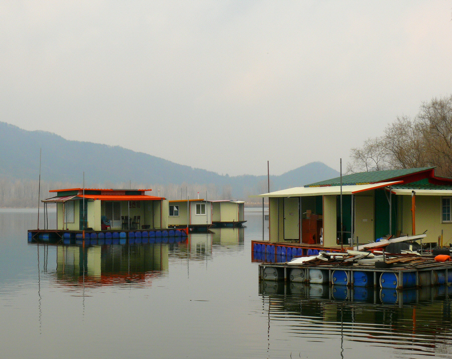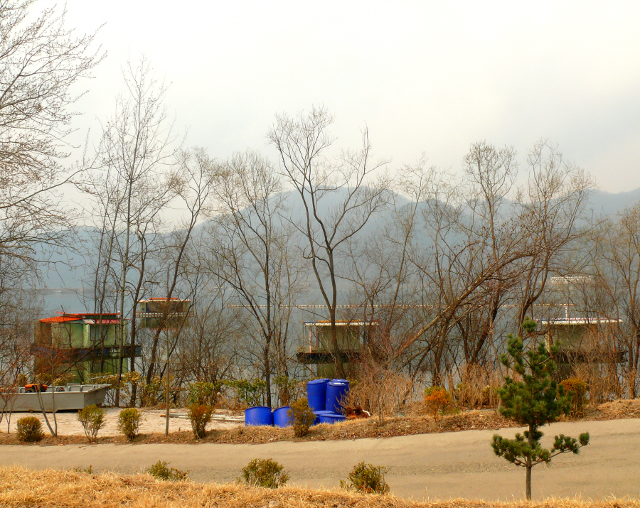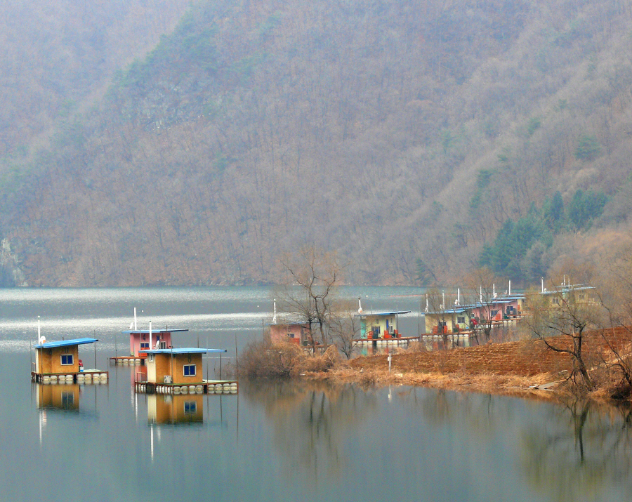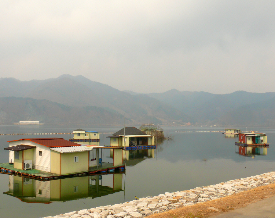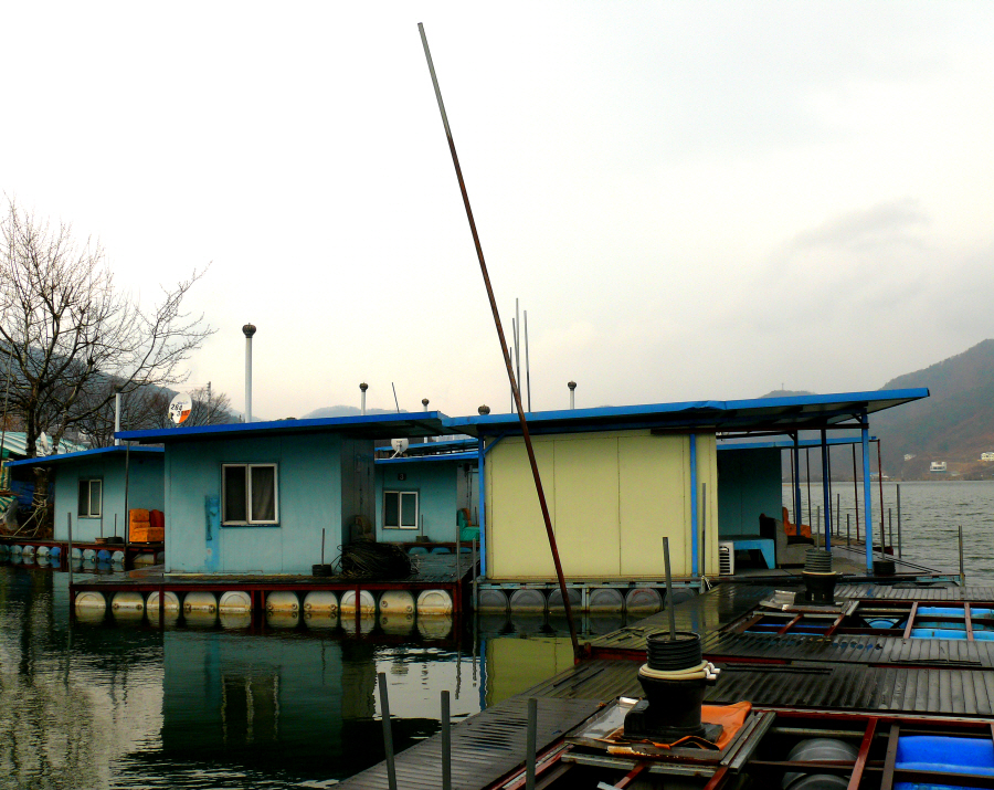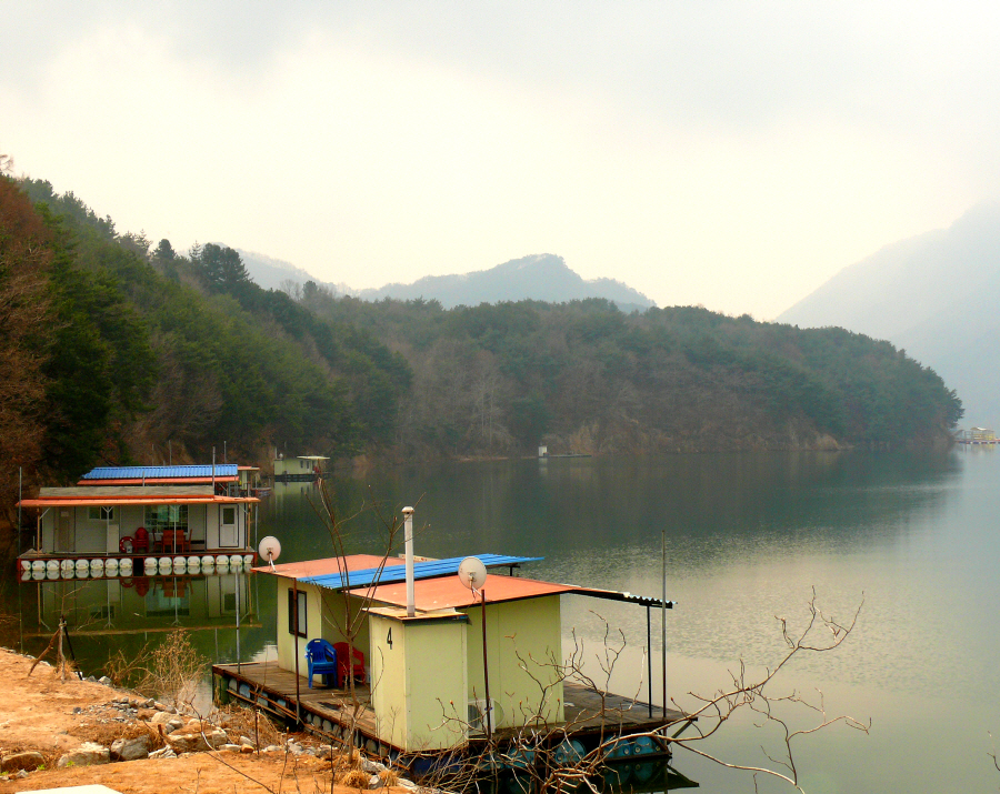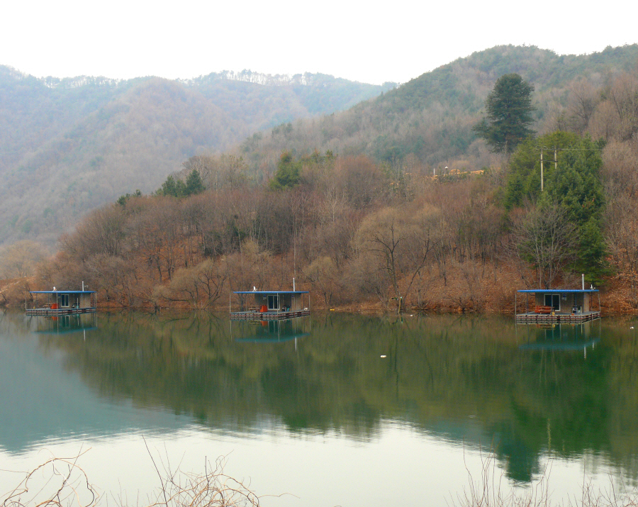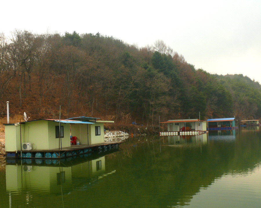 고탄낚시터 상류권에 자리잡은 수상좌대들입니다.