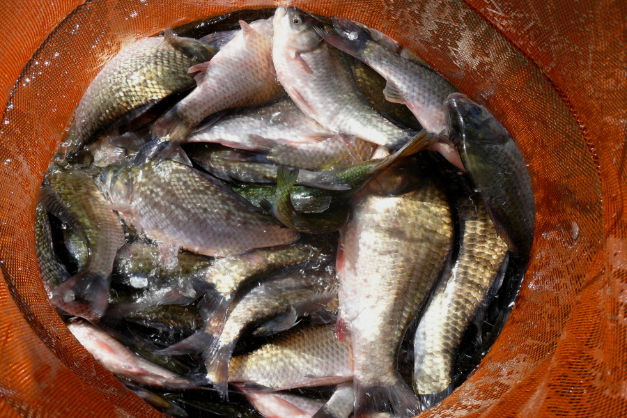 상류권에서 바닥낚시를 한 조사의 묵직한 살림망입니다.