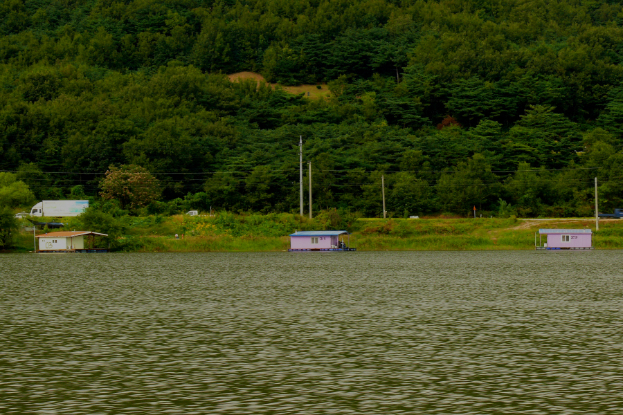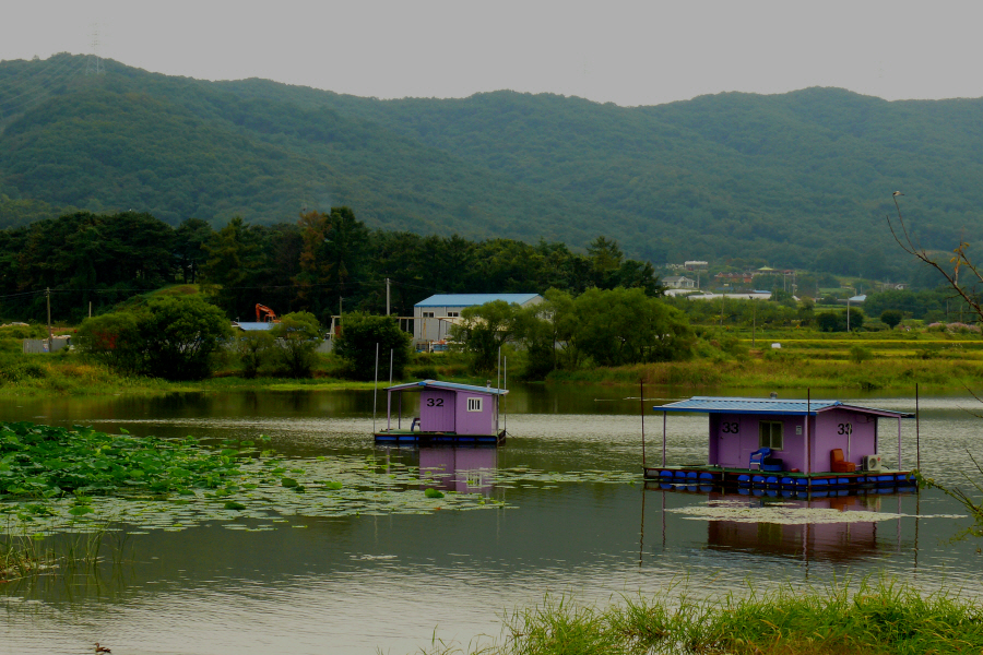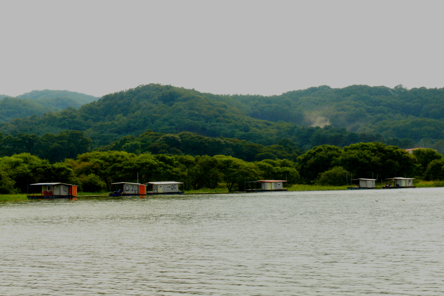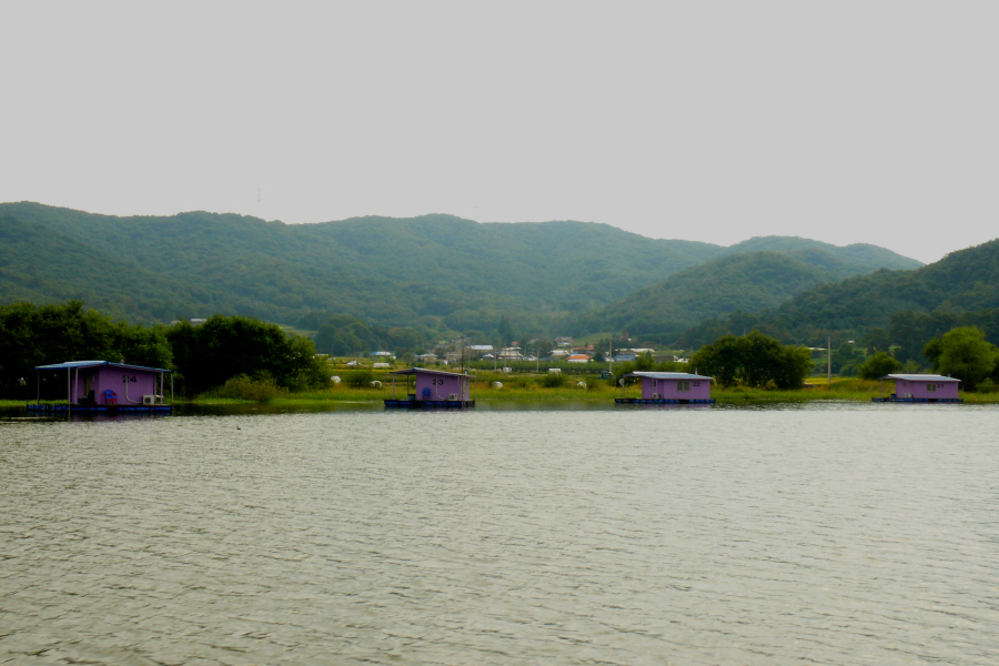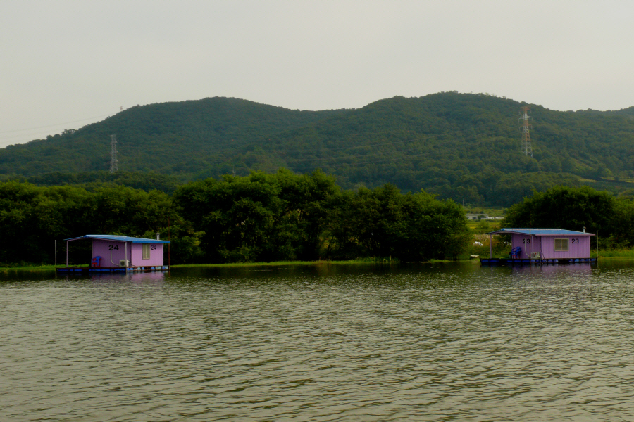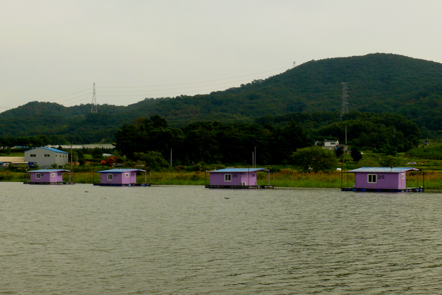 안골지 상류 연안 수초대에 자리잡은 수상좌대입니다.