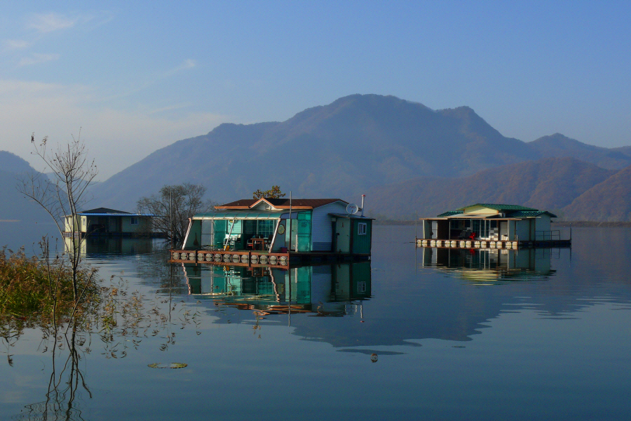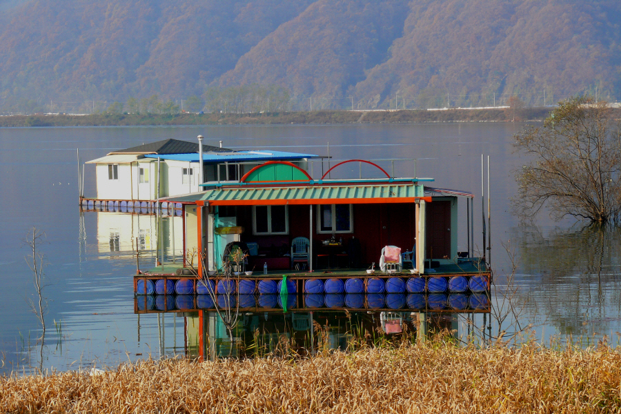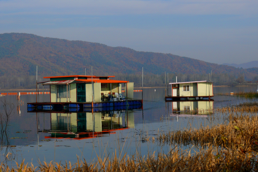 수초대에 배치되어 있는 팬션형과 콘도형좌대입니다.