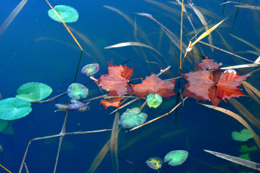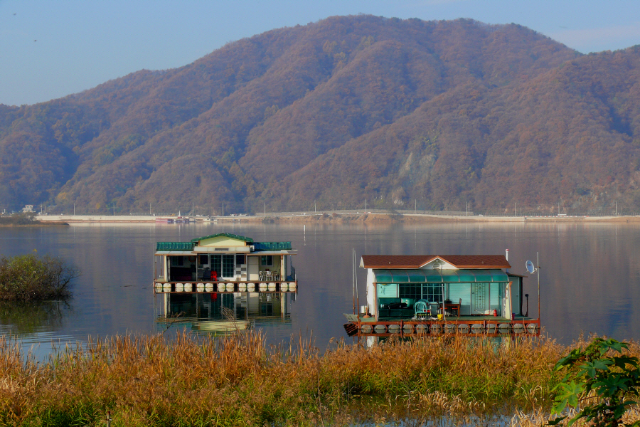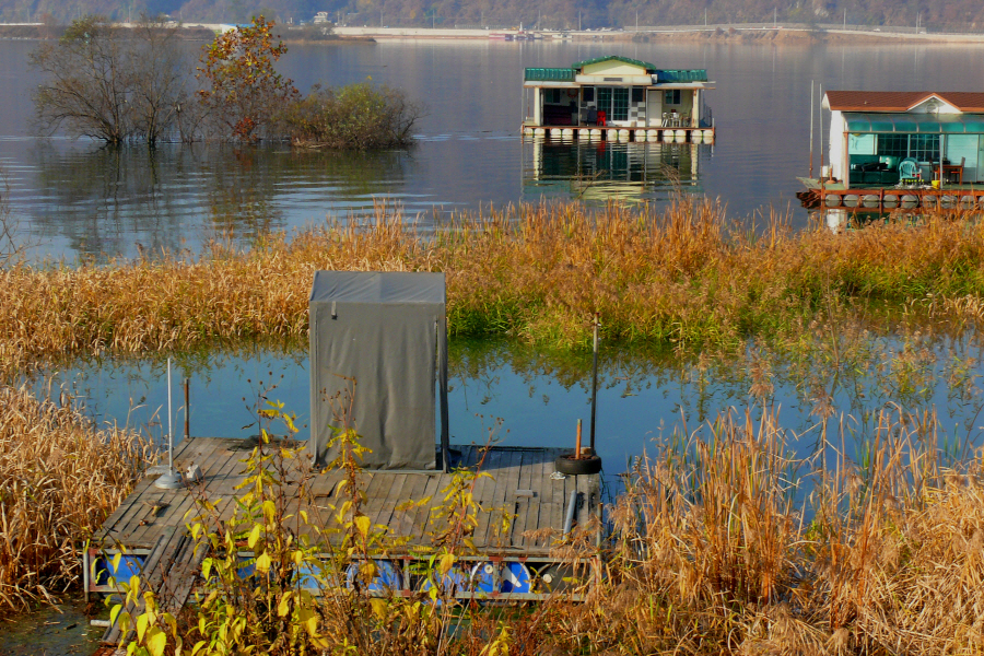 플라다나스 나무잎이 바람에 날리면서 가을 색깔을 더욱 진하게 만들었으며, 만수위로 잠겨진 부들수초들은 완연한 가을색이다.