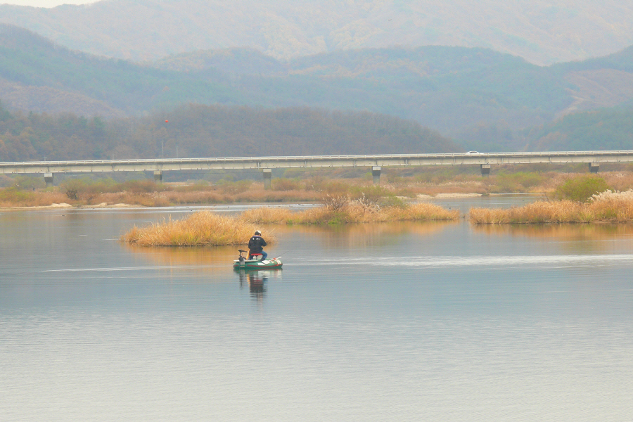 한가롭게 떠 있는 배스낚시를 즐기는 사람입니다.