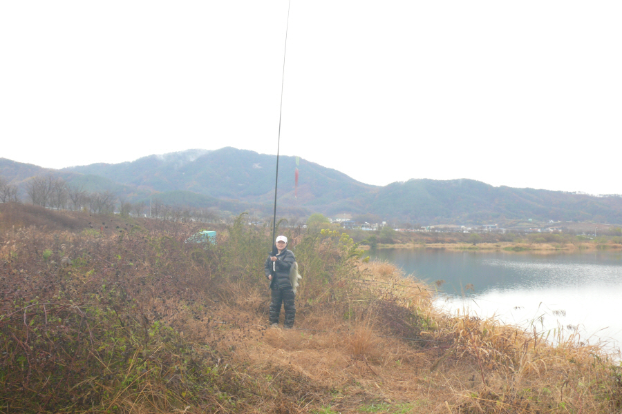 필자가 마눌님 장비를 철수하는 동안에 수초채비를 드리운지 10분 만에 마눌님도 튼실한 붕어 한 수 걸어 냅니다.
