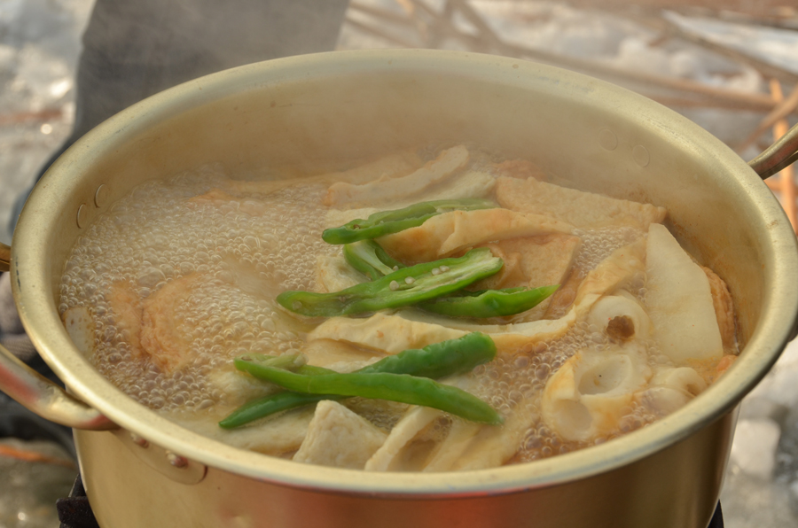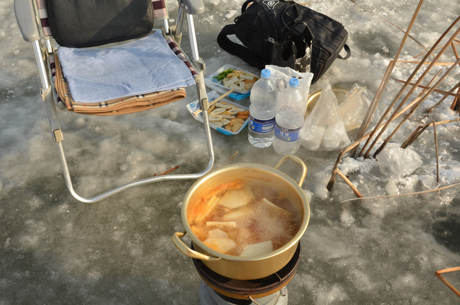 2.0칸 두대를 채비하여 드리고, 필자가 준비한 어묵탕을 끊이기 위해 준비해간 육수에 무우를 넣고 끓입니다.