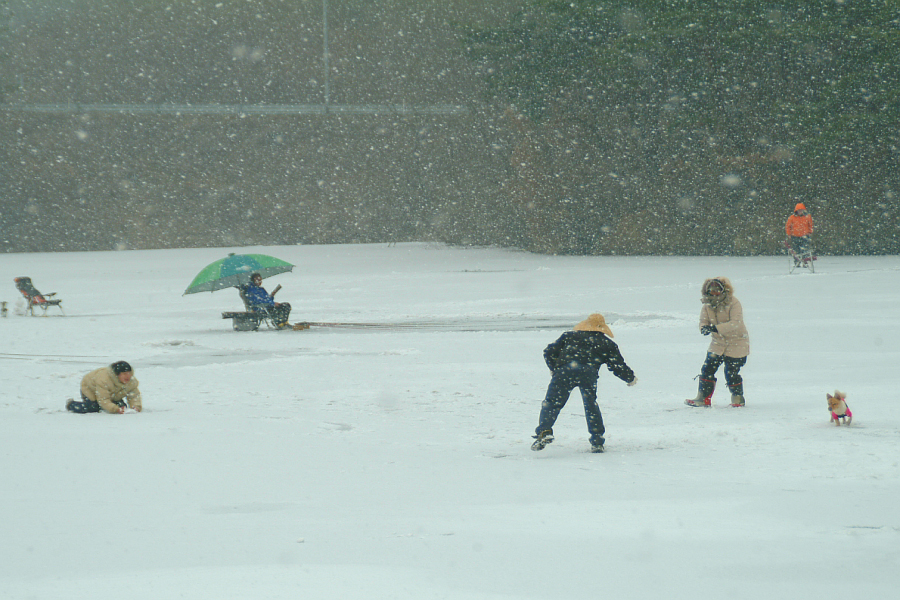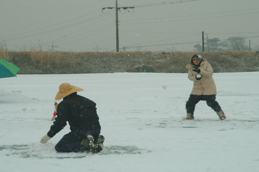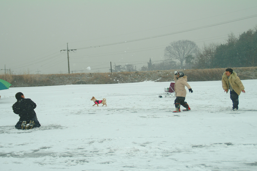 눈이 쏟아지니 즐겁게 눈싸움이나 하자고 박프로님과 마눌님이 먼저 선공을 시작합니다.