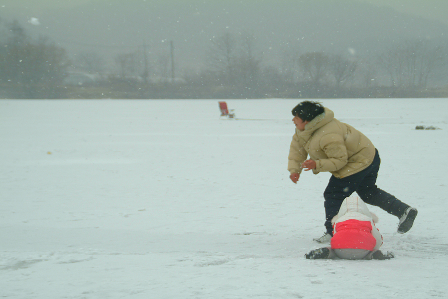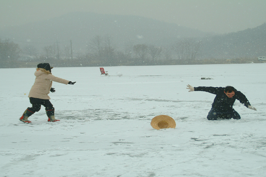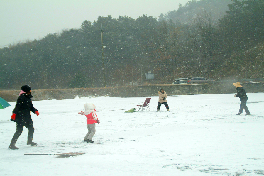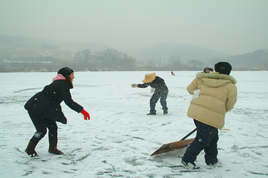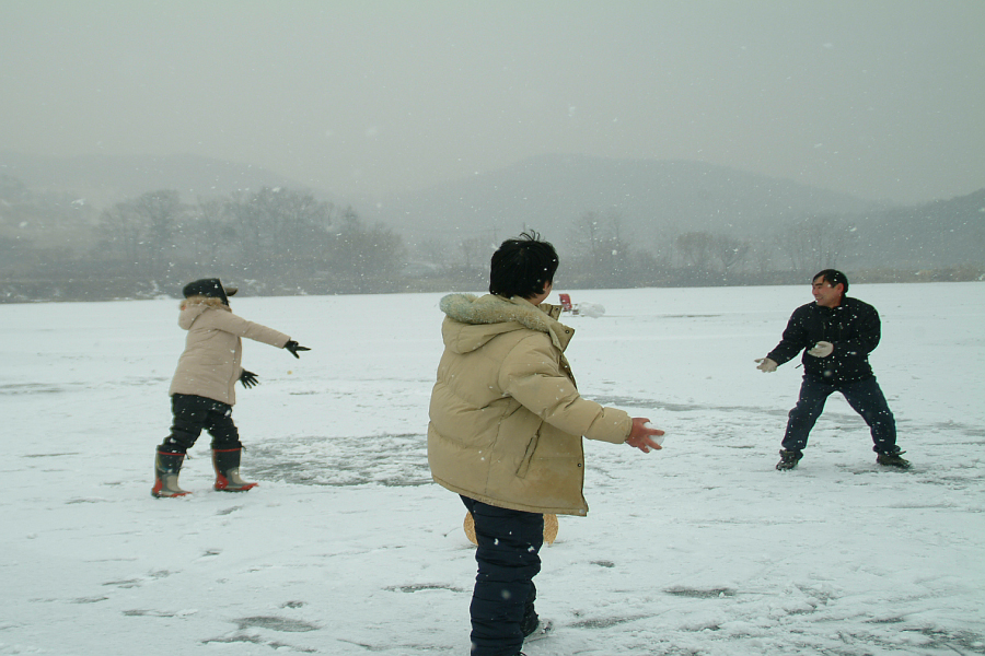 아들과 민서, 민서엄마까지 합세해서 신나는 얼음판 위에서 눈싸움이 시작되었습니다.