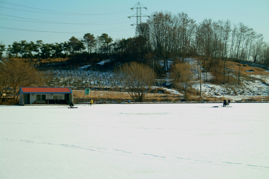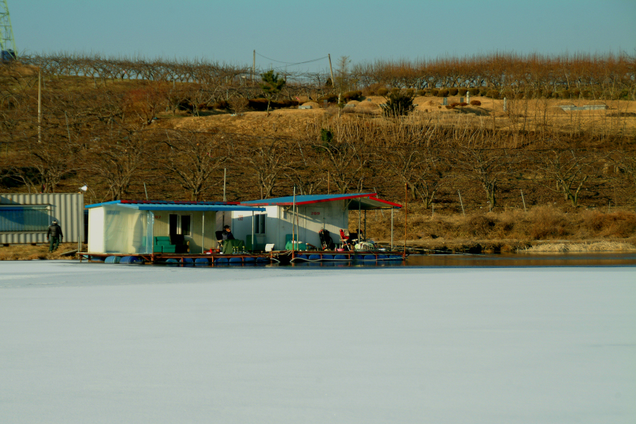 전체적으로 결빙이 잘 된 마정지는 연안에 붙혀 놓은 수상좌대 4개동은 물낚시가 가능하게 얼음을 녹여 놓은 상태였지만