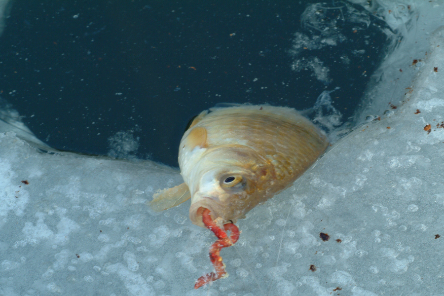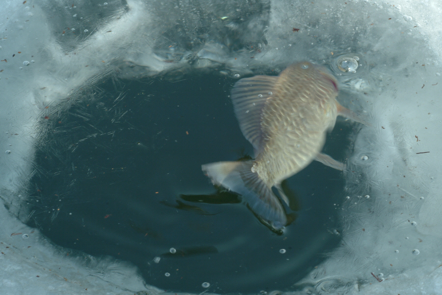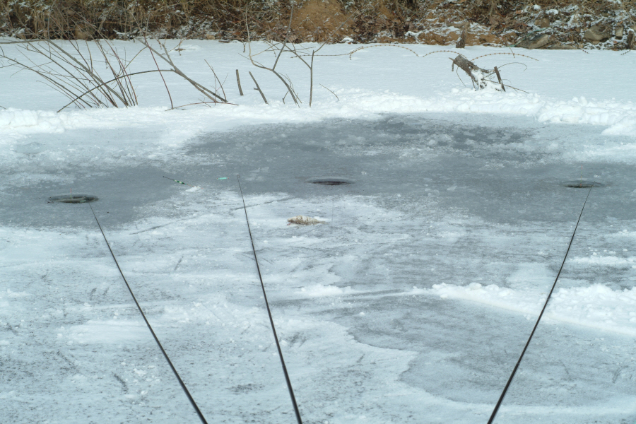 수몰된 나무 포인트에 채비를 안착시킨 필자가 유일하게 붕어 얼굴을 본 것이 깨끗한 소류지에서 처음 해 본 얼음낚시가 되었습니다.