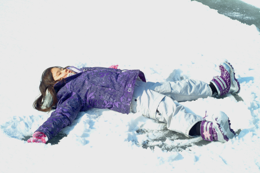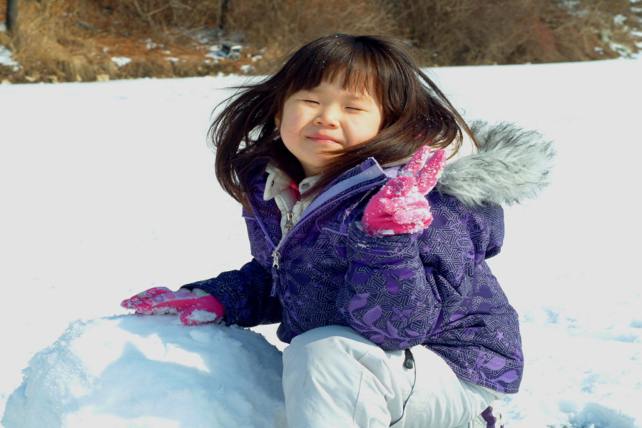 스스로 눈공주라 하면서 눈위에 누워 퍼덕거리는 서진이입니다.
