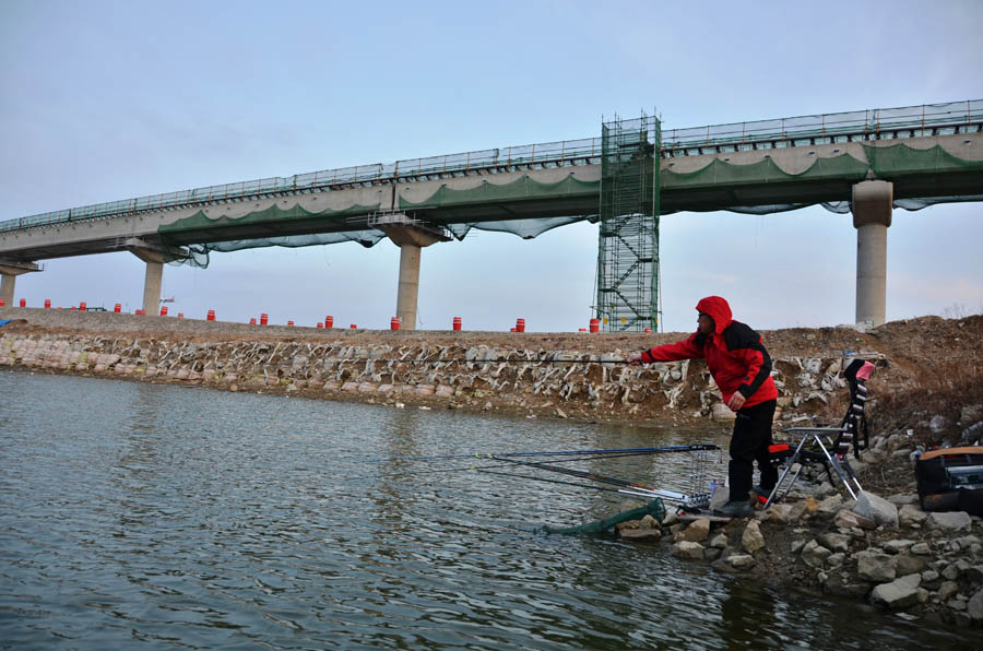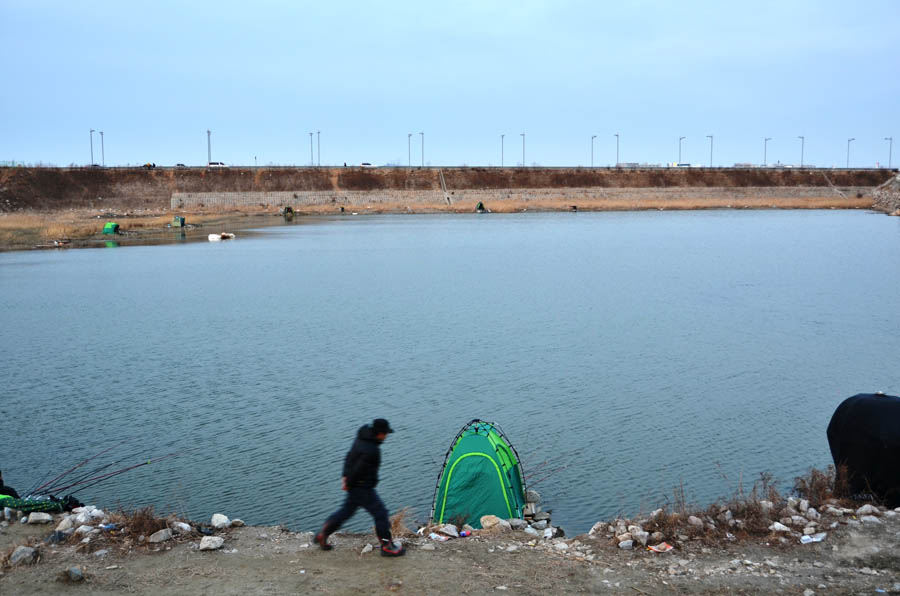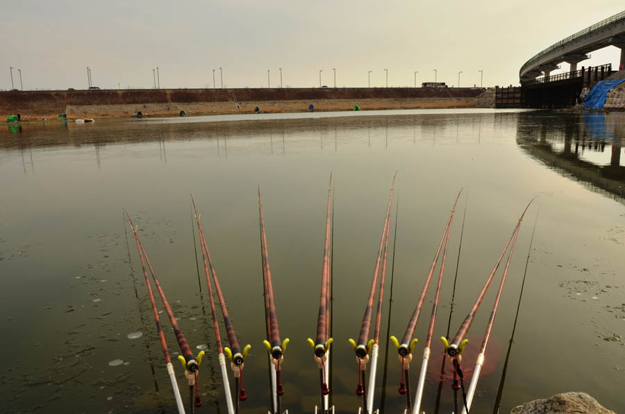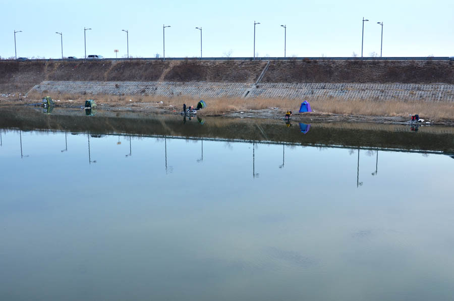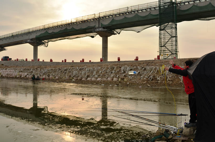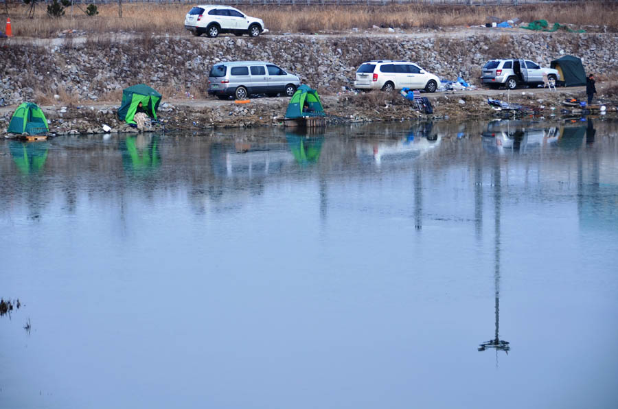 아주 맑은 날은 아니지만 나름 멋진 일출을 담고 낚시 자리로 돌아오니 양지 바르고 바람이 이는 곳은 얼음이 녹아 낚시가 가능하고,