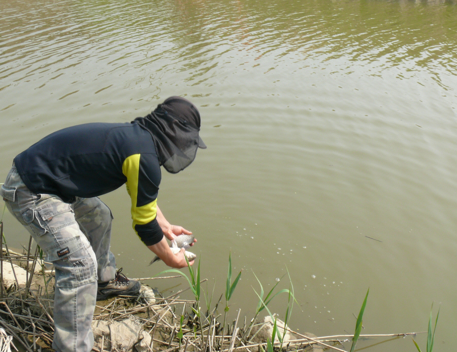 오전 9시경 더위가 느껴 질 정도에 찌를 한마디 올려 주는 것을 챔질을 해보니 9치급 붕어가 첫 얼굴을 보여줍니다.