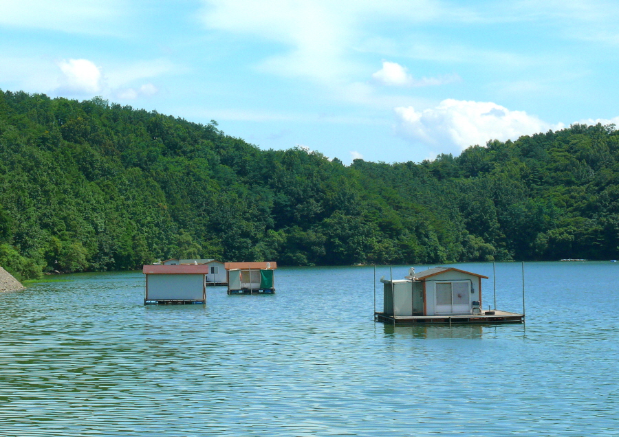 봉림지 상류권에서 하류권 우측편 포인트에 자리잡은 수상좌대들 전경