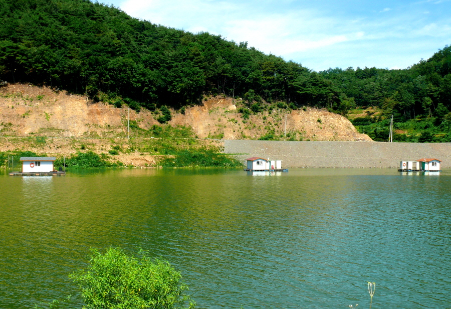 봉림지 상류권에서 하류권 좌측편 포인트에 자리잡은 수상좌대들 전경