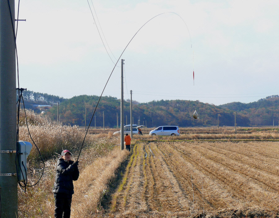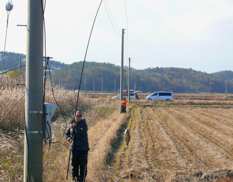 7치급을 시작으로 붕어를 걸어 내더니 이내 "여보!" 하고 큰소리를 칩니다.