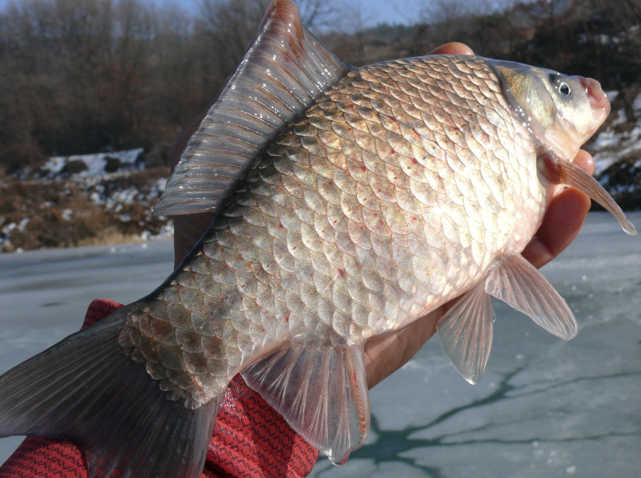 1시간 동안 입질이 없어서 다른 곳으로 이동을 할까 하고 고민을 하는데 마눌님이 꽉찬 9치급 붕어를 걸어 냅니다.