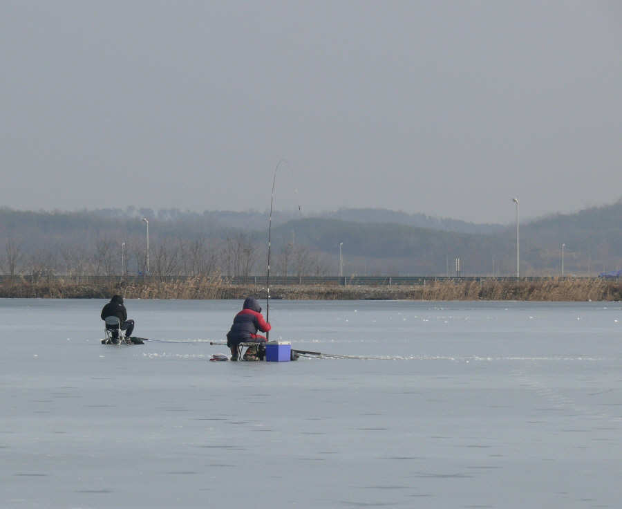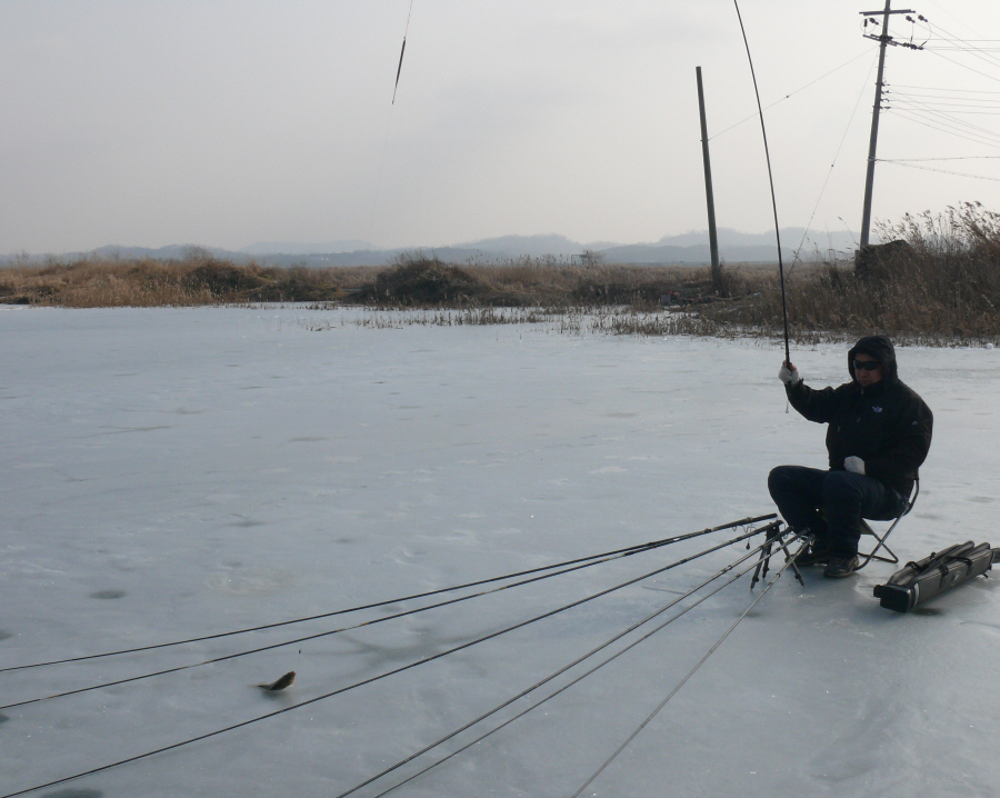 휴가를 낸 맨꽝님과 방앗간 동생 이렇게 세명이서 칼바람 속에 얼음에 구멍을 뚫고 낚시를 했는데