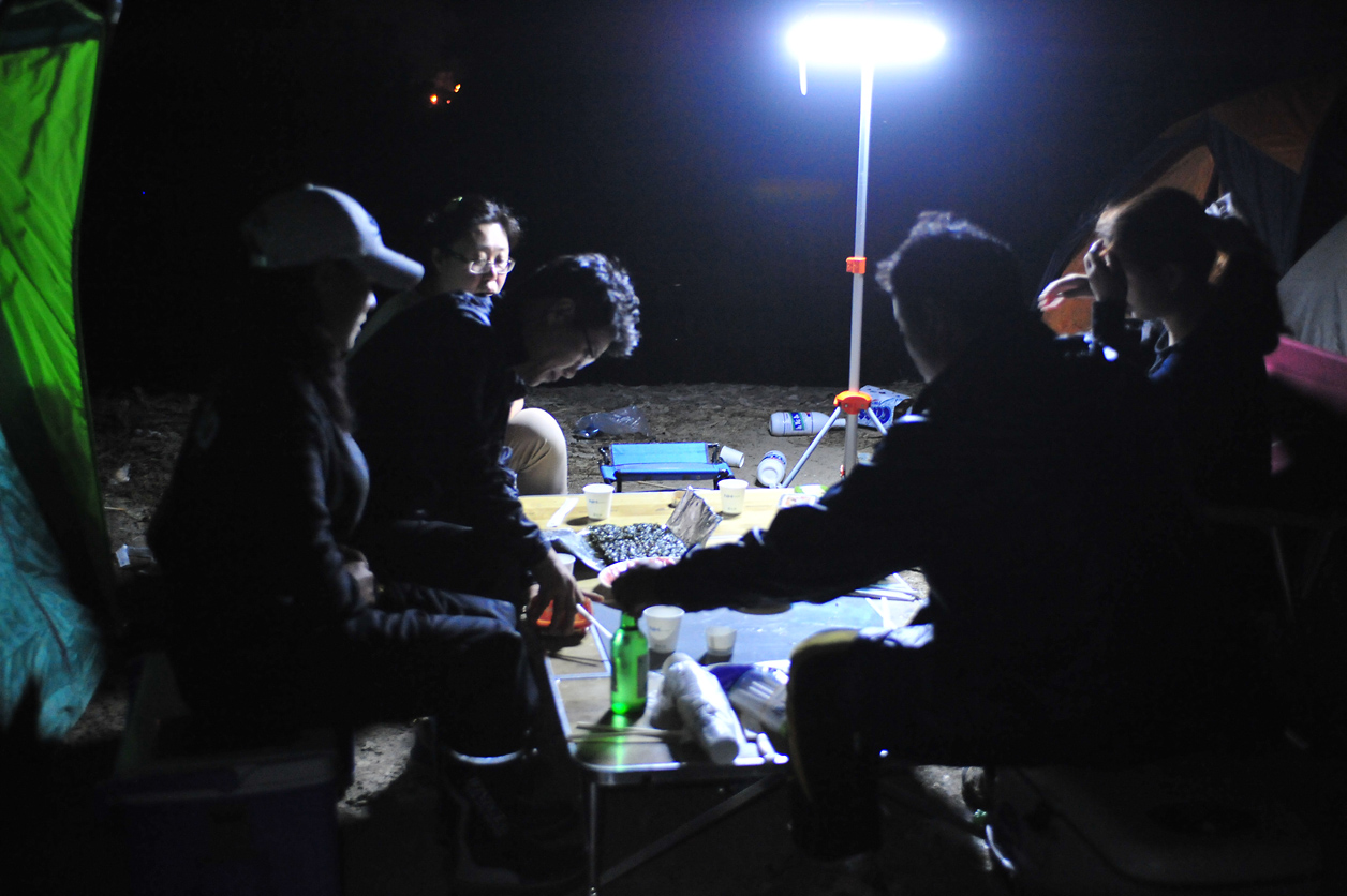 얼른 낚싯대 펴고, 텐트펴고, 함께 모여 맛난 음식과 이슬이로 즐거운 시간을 나눕니다.