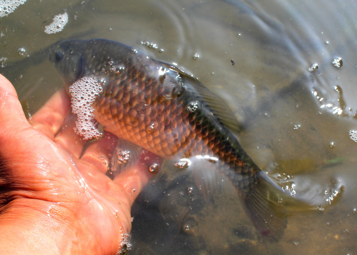 동자게 3마리를 걸어 내고나서 8치급 붕어 한마리가 찌를 끝까지 올려 주었는데