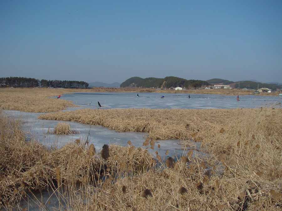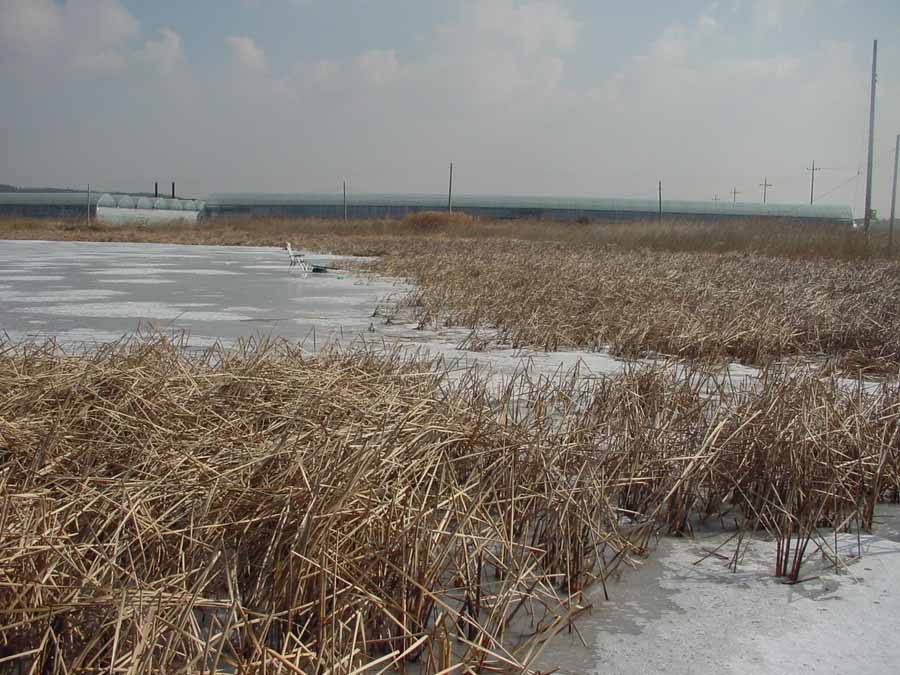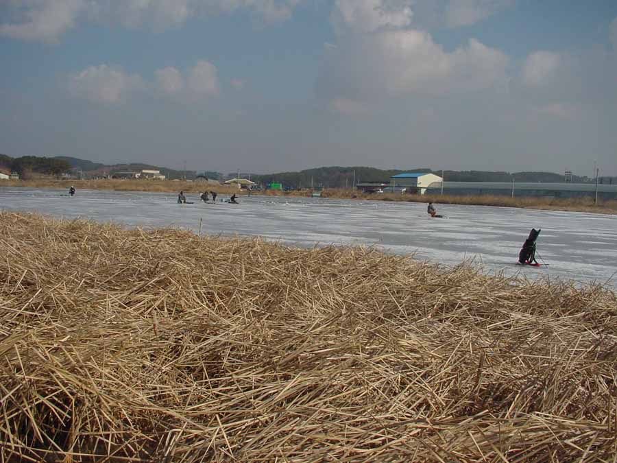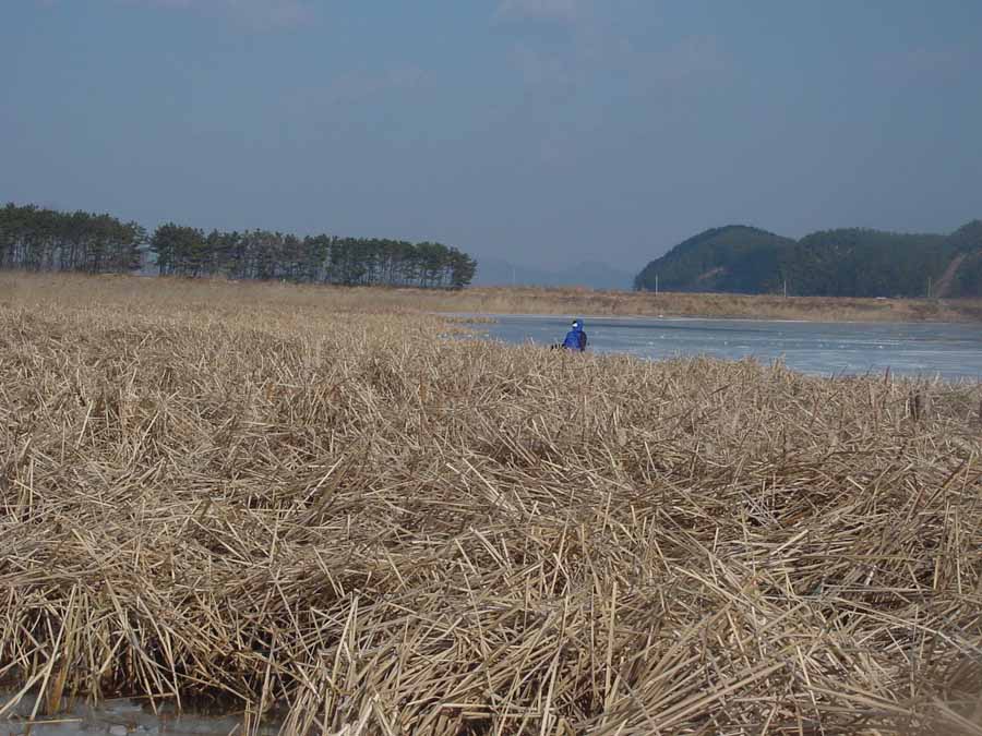 진산지는 연안 전역에 부들과 갈대 수초군을 이루고 있어 수초대 진입과 저수지 중앙에는 숨구멍이 있어 불안한 모습이였다.
