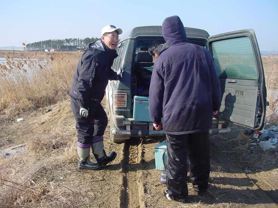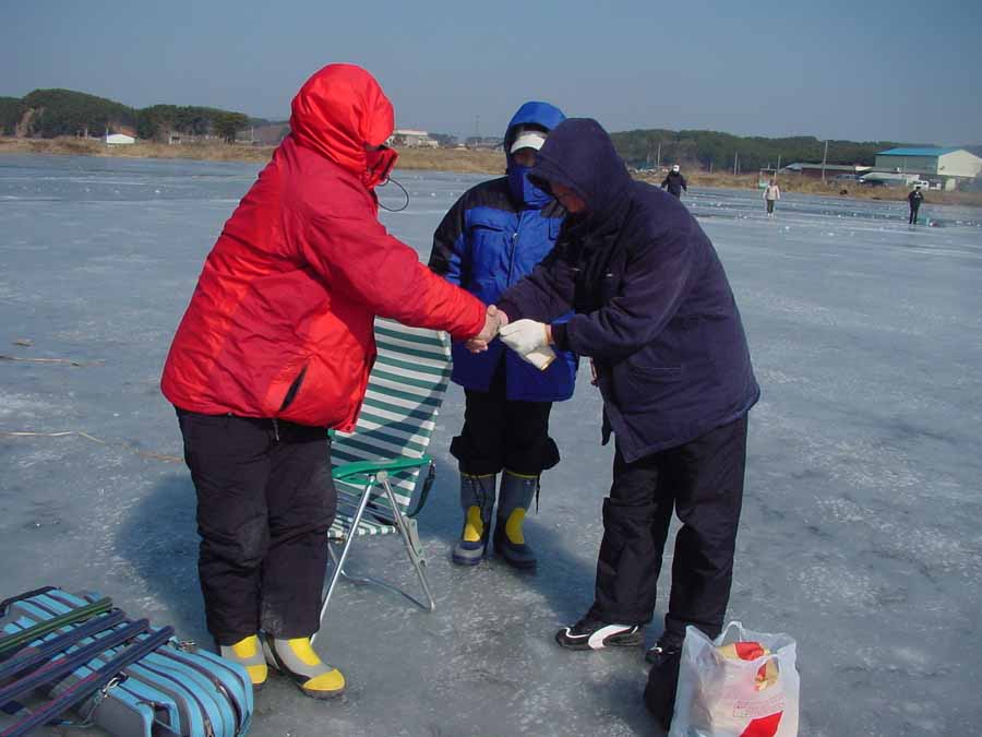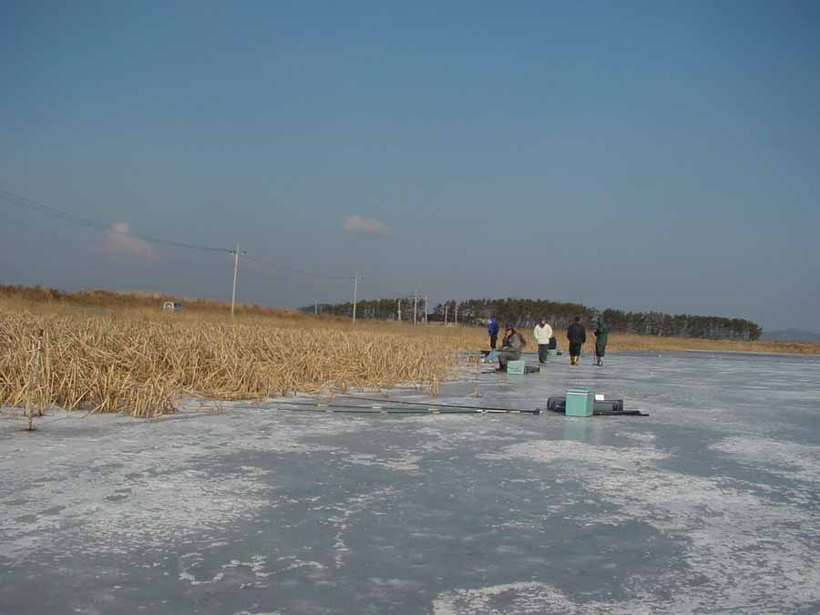 이른 아침시간이라 튼튼한 빙판을 택해 비교적 안전한 자리에 자리를 잡았지만