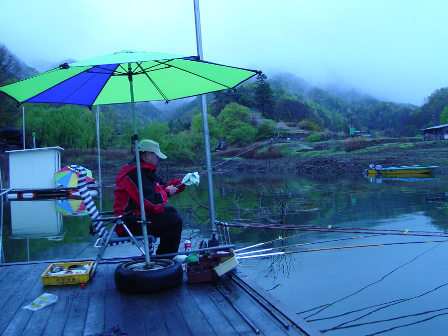 이슬비가 오는 가운데 낚시대 세팅을 마치고 나니 빗방울이 점점 굵어진다.