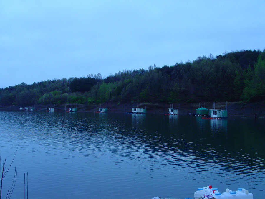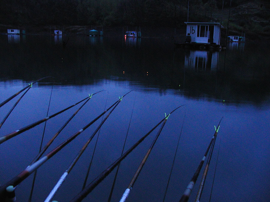 낚싯대와 케미, 그리고 건너편 좌대들의 모습이 대조적이다