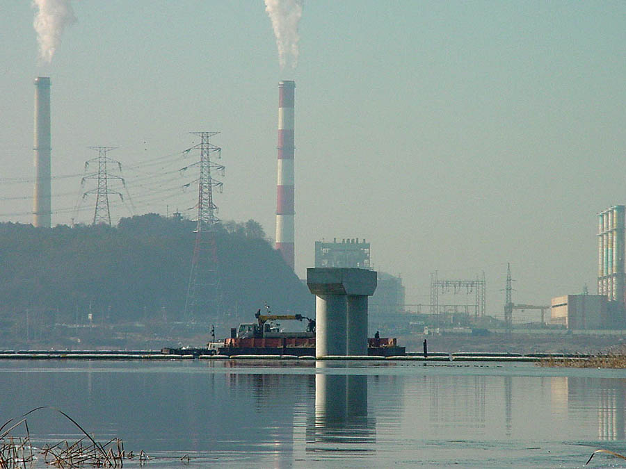 화력발전소의 연기가 똑바로 하늘로... 바람 한점없습니다.