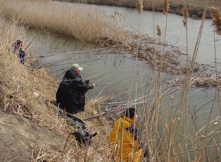 갈대와 부들이 삭은 포인트에서 낚시중인 주말팀